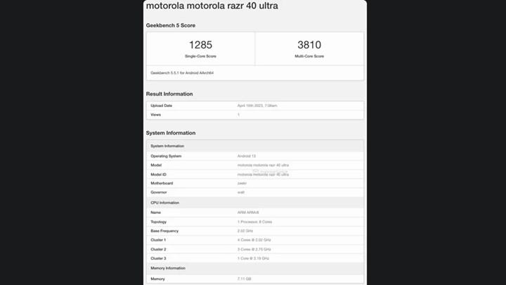 Geekbench listesi, Motorola Razr+ 2023’ün belirli pazarlarda Motorola Razr 40 Ultra olarak adlandırılacağını bizlere gösteriyor. Bununla birlikte Geekbench platformunda Qualcomm Snapdragon 8+ Gen 1 yonga seti ile test edilen model, tek çekirdekte 1285, çoklu çekirdekte ise 3810 puan alıyor. Burada ufak bir kıyaslama ile Snapdragon 8 Gen 2’nin ortalama 1524 ve 4597 puana ulaştığını da hatırlatalım.