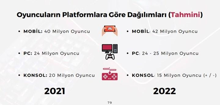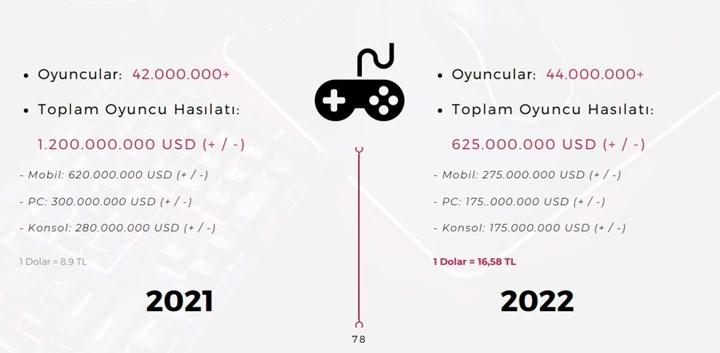 Paylaşılanlara göre 2021’de 52 oyun firmasına toplam 264,8 milyon dolarlık yatırım yapılırken 2022’de yaklaşık yüzde 60 artışla 424,7 milyon dolarlık yatırım gerçekleştirildi. Gaming in Turkey kurucusu Ozan Aydemir, “Oyun sektörüne yön veren ana etmen yine ‘mobil’ oldu” dedi. Raporda ekonomik etmenlerin oyuncu davranışlarını olumsuz etkilediğinin altı çiziliyor. 2021’de 8.9 TL olan ortalama Dolar kurunun 2022’de 16.58 TL’ye yükseldiği, PC ve konsol platformlarında yeni çıkan büyük oyunların 800 – 1500 TL gibi fiyat etiketlerine sahip olduğu ve bu nedenle bazı oyuncuların PlayStation Plus, Xbox Game Pass gibi abonelik sistemlerine yöneldiği aktarılıyor.Türk oyun sektörü