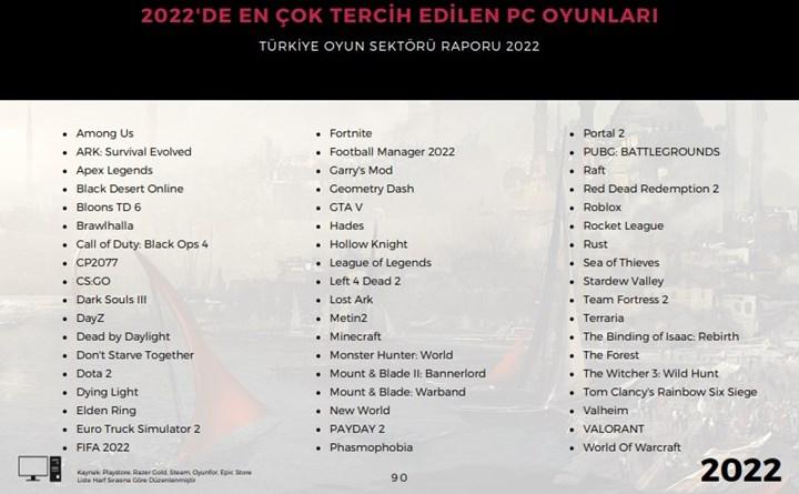 Bununla birlikte Türk oyun sektörü önemli de bir yara aldı. Türkiye, 2021 yılında sektör değeri bakımından dünya sıralamasında 18. konumdayken 2022 yılında ise çok ciddi bir gerileme ile 30. sıraya düştü. Toplam hasılat da neredeyse yarı yarıya düşerek 625 milyon dolara geriledi. Son olarak, geçtiğimiz yıl 42 milyon olan Türkiye’deki toplam oyuncu sayısı 44 milyona ulaştı. Türkiye’deki oyuncuların yüzde 52’si erkek, yüzde 48’i kadın. 18-24 yaşın yüzde 27’si, 25-34 yaşın yüzde 38’i, 35-44 yaşın yüzde 30’u, 45-54 yaşın yüzde 4’ü, 55-64 yaşın yüzde 1’i oyun oynuyor. Türkiye’deki mobil oyuncuların en sevdiği oyun türü yüzde 54 ile geçen yıl olduğu gibi puzzle-trivia-kelime oyunları olurken, kart oyunları yüzde 52 ile ikinci, aksiyon-macera oyunları ise yüzde 46 ile 3’üncü sırada bulunuyor.2022’de en çok oynanan PC oyunları