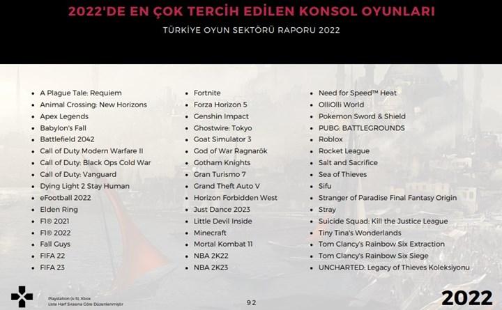 Raporda hyper-casual oyunlar yavaş yavaş trend olmaktan çıkarak yerini casual ve midcore-casual oyunlara bırakmış olduğu söyleniyor. Öte yandan Battle Royale, FPS, Yarış, Spor Strateji ve MOBA oyun türleri hala en popüler türler olarak yerlerini koruyor. Buna göre Türkiye 2022’de mobilde; Subway Surfer, PUBG Mobile, Roblox, 101 Okey Plus, Words Of Wonders, Free Fire, Mobile Legends, Genshin Impact, Kafa Topu 2 ve benzeri oyunları tercih ederken PC ve konsollara baktığımızda; God Of War Ragnarok, Genshin Impact, PUBG, Lost Ark, VALORANT, LoL, CS: GO, Minecraft, Roblox, Call Of Duty öne çıkan oyunlar arasında yer alıyor.